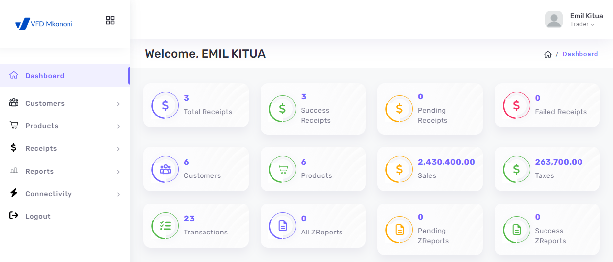 VFD MKONONI is an application system which is directly connected to TRA Tax Administrator Server to enable the tax payer issue fiscal receipts with QR Code in real-time. Through the platforms, taxpayers can register products/services, record sales transactions, print or share fiscal receipt with customer, view different reports depending on the selected package etc.